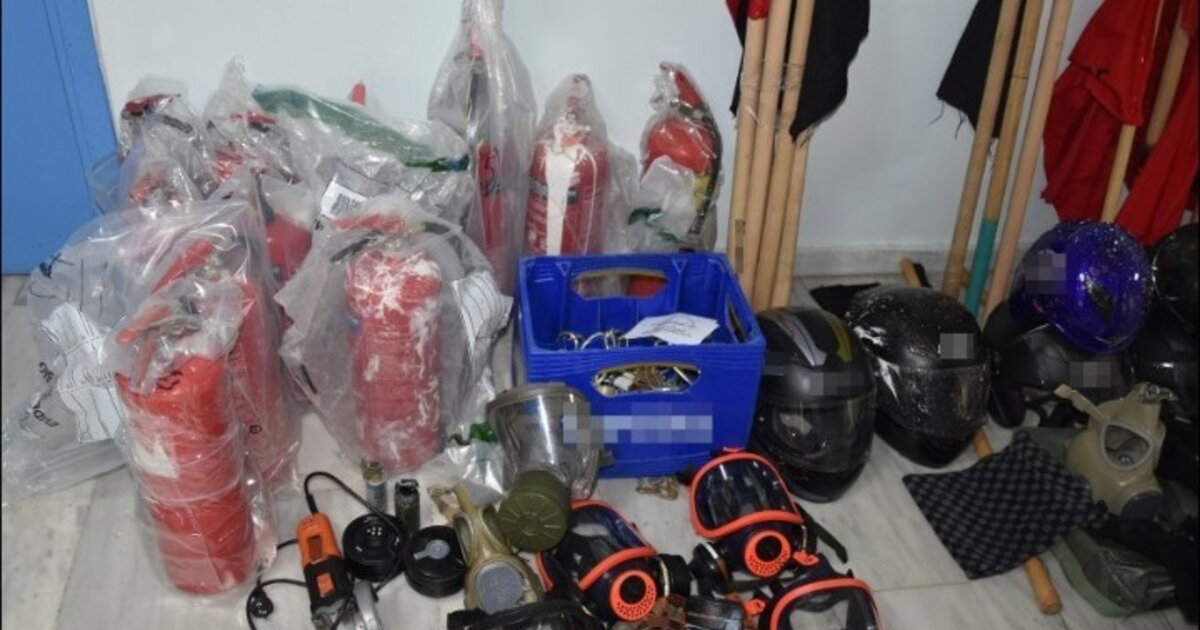 Επίσης εντοπίστηκαν και κατασχέθηκαν δύο δίσκοι κοπής, ένα μεταλλικό κλειδί τροχού, μία βαριοπούλα, έξι κράνη δικυκλιστή, δύο ενεργοποιημένες αστυνομικές χειροβομβίδες χειρός (κρότου λάμψης και δακρυγόνο), ένας φορητός ηλεκτρονικός υπολογιστής, είδη ρουχισμού (γάντια, μπαλακλάβες) και πλήθος λουκέτων και αλυσίδων θυρών.