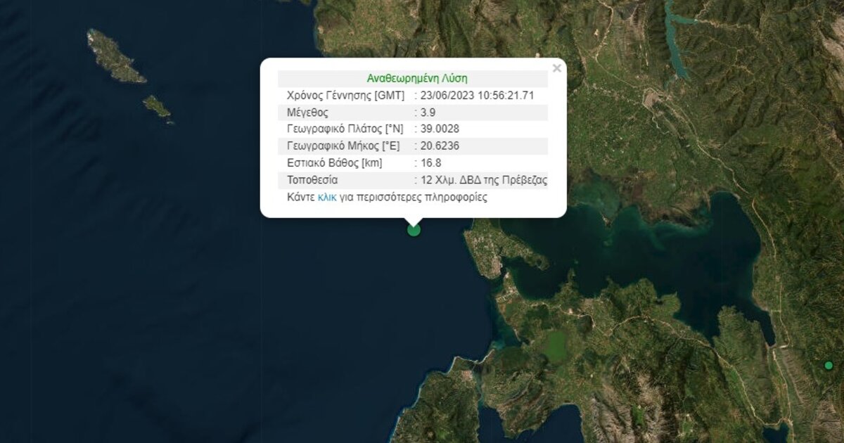 Σεισμική δόνηση σημειώθηκε στις 13:56 σήμερα (23/6), 12 χιλιόμετρα Δυτικά – Βορειο Δυτικά της Πρέβεζας.