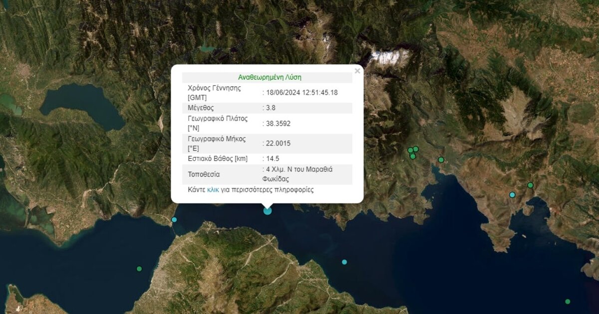 Σεισμική δόνηση μεγέθους 3,8 Ρίχτερ σημειώθηκε αργά το μεσημέρι της Τρίτης 18 Ιουνίου, στον Μαραθιά Φωκίδας.