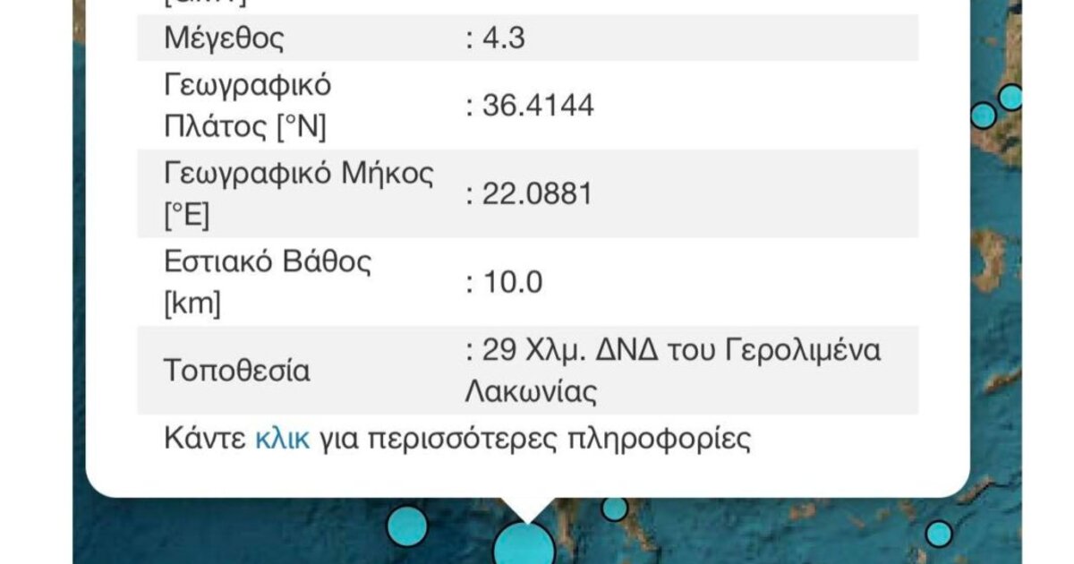 Σεισμός 4,3 Ρίχτερ ανοιχτά του Γερολιμένα Λακωνίας