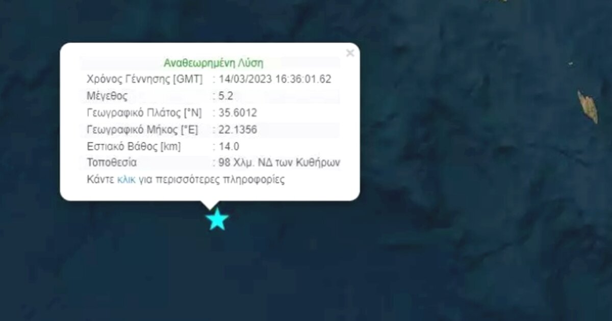 Σεισμική δόνηση μεγέθους 5,2 βαθμών της κλίμακας Ρίχτερ σημειώθηκε στις 18:36, 118,5 χλμ νοτιοδυτικά των Κυθήρων.