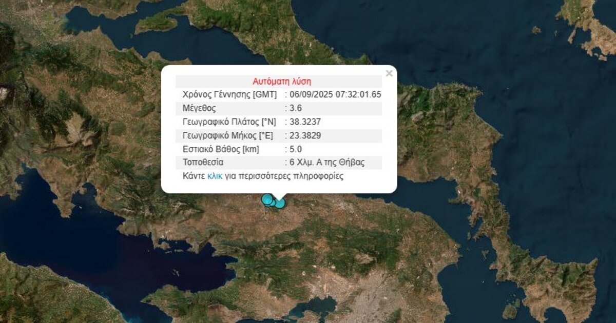 εισμός μεγέθους 3,6 Ρίχτερ, σύμφωνα με την πρώτη εκτίμηση του Γεωδυναμικού Ινστιτούτου, σημειώθηκε στις 10:32 το πρωί του Σαββάτου με επίκεντρο 6 χιλιόμετρα ανατολικά της Θήβας.
