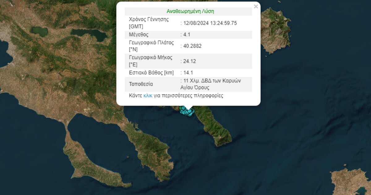 Σεισμός μεγέθους 4,1 Ρίχτερ σημειώθηκε νωρίς το απόγευμα της Δευτέρας στο Άγιο Όρος.