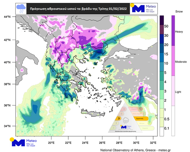 Στους χάρτες των Εικόνων 2 και 3 παρουσιάζεται ο υετός (βροχή/χιόνι) που αναμένεται τις απογευματινές και βραδινές ώρες της Τρίτης 01/02 αντίστοιχα.