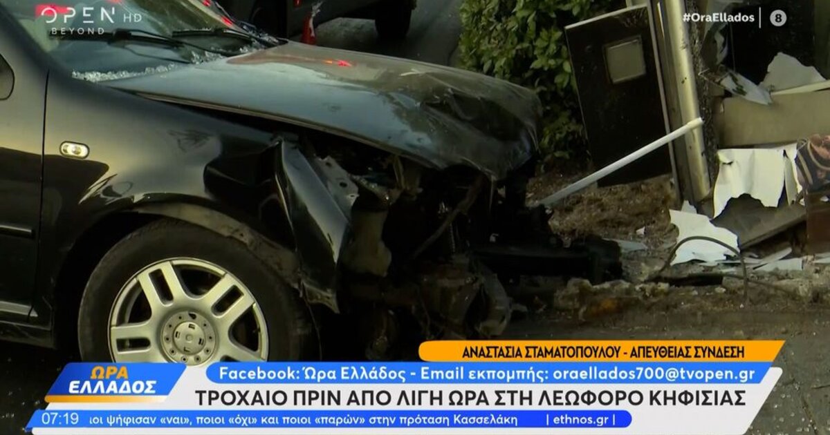 Ένα αυτοκίνητο που κινούνταν στη λεωφόρο Κηφισίας ξέφυγε από την πορεία του και καρφώθηκε πάνω σε στάση λεωφορείου και μετά σε κολώνα στο Ψυχικό.