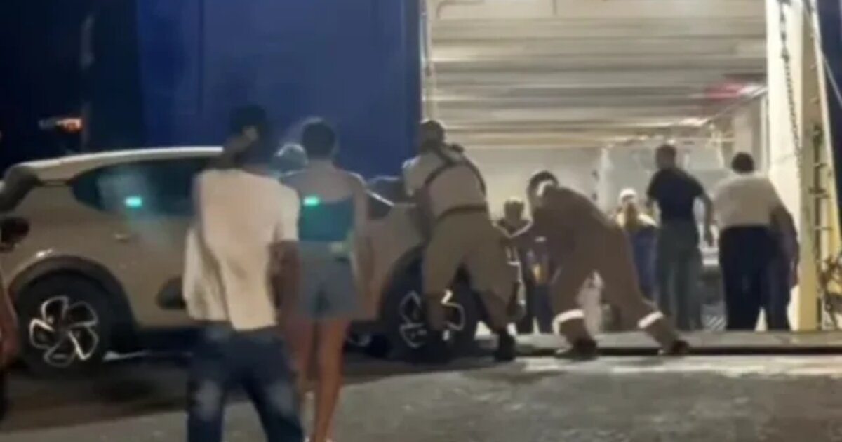 Όπως διακρίνεται, επιβάτες και μέλη του πληρώματος προσπαθούν να βοηθήσουν έναν οδηγό ΙΧ αυτοκινήτου να εισέλθει εντός του πλοίου, όμως μάταια. Κι αυτό γιατί ο καπετάνιος αποφασίζει να σηκώσει τη μπουκαπόρτα και το πλοίο να αναχωρήσει, με αποτέλεσμα το αυτοκίνητο να βρεθεί στο χείλος της προβλήτας.