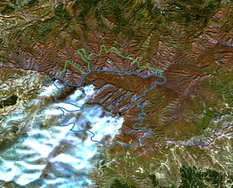 Στη φωτογραφία διακρίνεται η περίμετρος της καμένης έκτασης που αντιστοιχεί στην Ελλάδα (μπλε περίγραμμα) και στη Βουλγαρία (πράσινο περίγραμμα), σύμφωνα με τα διανυσματικά δεδομένα του Copernicus EMS στις 5/11/2022.