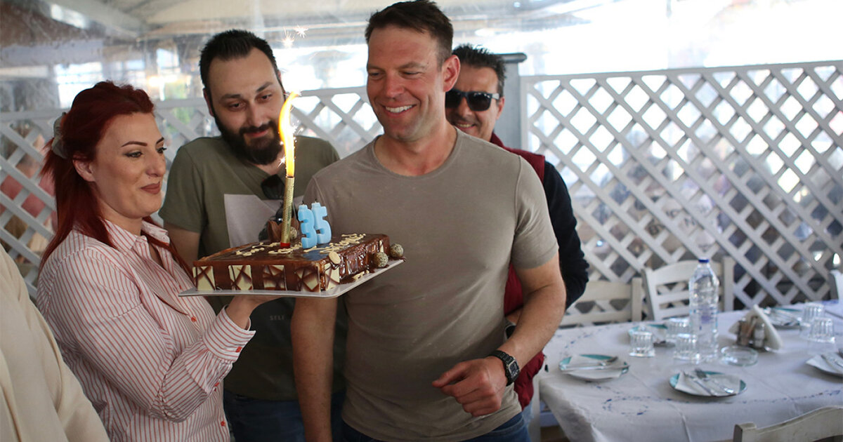 Αφού πρώτα πέρασε την πύλη του στρατοπέδου του Κέντρου Εκπαίδευσης Νεοσυλλέκτων στη Θήβα καθώς ξεκίνησε η πενθήμερη άδεια που έλαβε μετά την ορκωμοσία του νωρίτερα σήμερα, επισκέφθηκε τοπική ταβέρνα όπου έσβησε τούρτα γενεθλίων με το νούμερο 35.