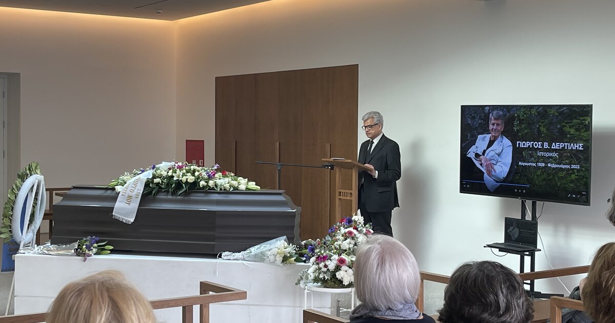 Με την μουσική από το Ρέκβιεμ του Μότσαρτ και με φωτογραφίες του στην οθόνη, αποχαιρέτησαν τον διακεκριμένο ιστορικό Γιώργο Δερτιλή η σύζυγός του Εριέττα Μαυρουδή, μέλη της οικογένειας, φίλοι και μαθητές του, την Παρασκευή 3 Μαρτίου στο Αποτεφρωτήριο της Ριτσώνας. Το βίντεο με τις φωτογραφίες επιμελήθηκε ο αγαπητός φίλος της οικογένειας Σταύρος Θεοδωράκης.