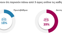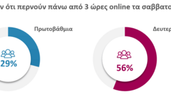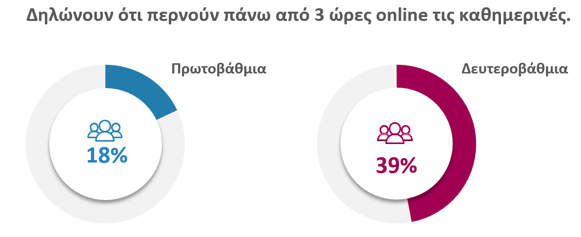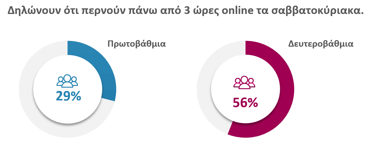 Η έρευνα καταγράφει σημαντικά ποσοστά υπερβολικής χρήσης των κοινωνικών δικτύων από ανήλικους, με το 56% των μαθητών Γυμνασίου/Λυκείου και το 29% των μαθητών Δημοτικού να δηλώνουν ότι περνούν πάνω από 3 ώρες τα σαββατοκύριακα online, ενώ και τις καθημερινές τα ποσοστά είναι ανησυχητικά αυξημένα. Στη Δευτεροβάθμια εκπαίδευση το 39% των μαθητών δηλώνει ότι χρησιμοποιεί το διαδίκτυο περισσότερες από 3 ώρες την ημέρα και στο Δημοτικό το 18% .