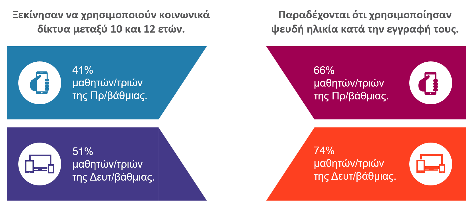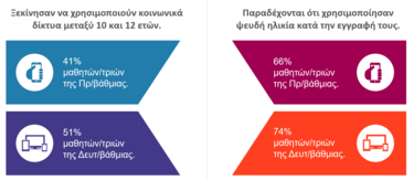 Συγκεκριμένα, το 41% των μαθητών Δημοτικού και το 51% των μαθητών Γυμνασίου/Λυκείου δήλωσαν ότι ξεκίνησαν να χρησιμοποιούν κοινωνικά δίκτυα μεταξύ 10 και 12 ετών, ενώ από τους μαθητές που χρησιμοποιούν κοινωνικά δίκτυα το 66% στο Δημοτικό και το 74% στη Δευτεροβάθμια εκπαίδευση παραδέχονται ότι δήλωσαν ψευδή ηλικία κατά την εγγραφή τους, παρακάμπτοντας με ευκολία τους μηχανισμούς ελέγχου ηλικίας (age gates).