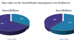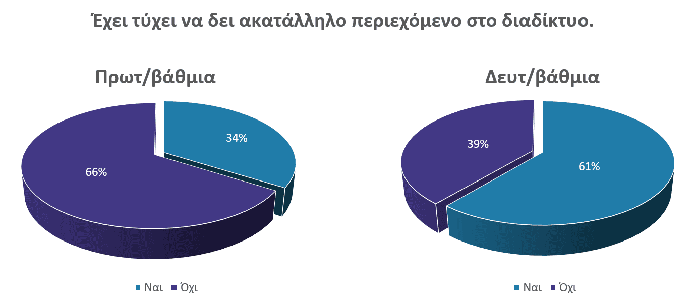 Το 34% των παιδιών Δημοτικού και το 61% των παιδιών Γυμνασίου/Λυκείου δήλωσε ότι έχει δει βλαβερό ή ακατάλληλο περιεχόμενο, και στην πλειονότητα των περιπτώσεων (πάνω από 60%) αυτό προέκυψε τυχαία.