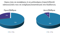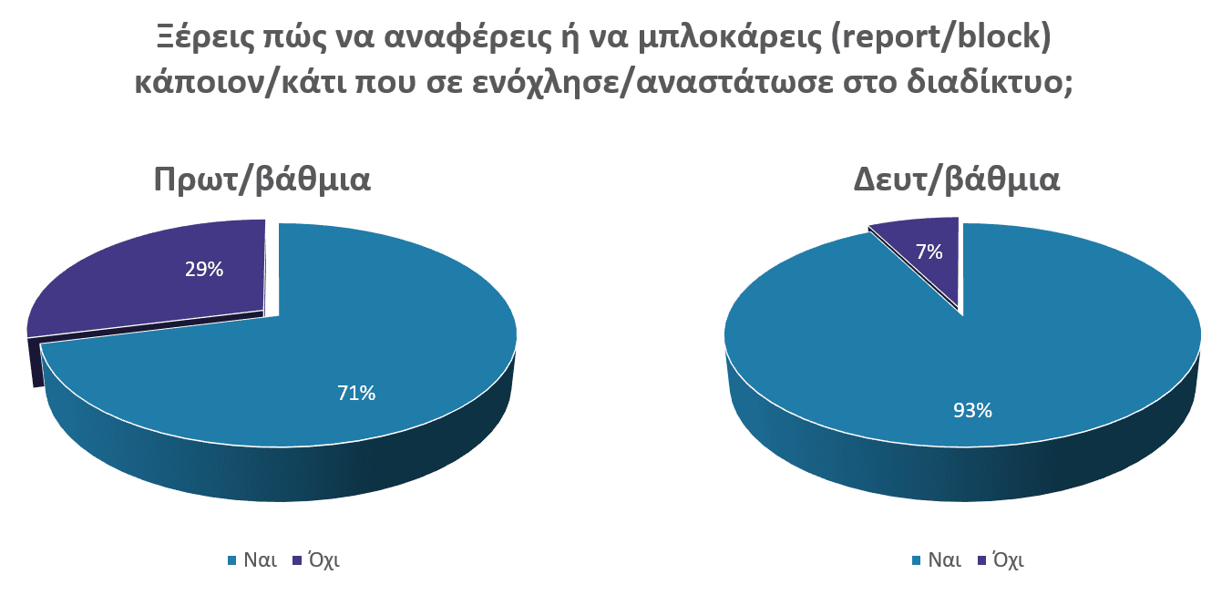 Η πλειοψηφία των μαθητών Δευτεροβάθμιας εκπαίδευσης (93 %) δηλώνει ότι γνωρίζει πώς να κάνει αναφορά (report) ή αποκλεισμό (block) περιεχομένου ή χρηστών, ενώ το 29 % των μαθητών Δημοτικού δηλώνει ότι δεν έχει τις ίδιες γνώσεις ή δεξιότητες.