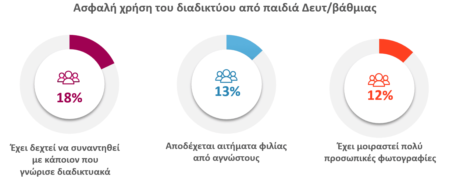 Αν και τα παιδιά Δευτεροβάθμιας εκπαίδευσης αισθάνονται ότι έχουν επαρκή ενημέρωση για την ασφαλή χρήση του διαδικτύου, η πραγματικότητα φαίνεται να απέχει. Το 18 % έχει δεχτεί να συναντηθεί με κάποιον που γνώρισε διαδικτυακά, το 13 % αποδέχεται αιτήματα φιλίας από αγνώστους, το 12% έχει μοιραστεί πολύ προσωπικές φωτογραφίες.