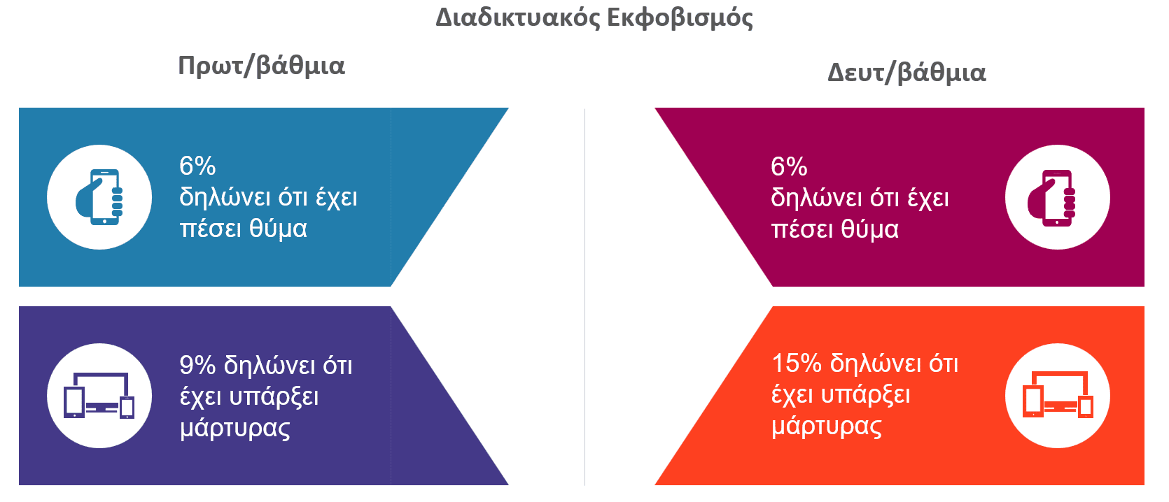 Ο διαδικτυακός εκφοβισμός αφορά τόσο μαθητές Δημοτικού όσο και τους μαθητές της Δευτεροβάθμιας εκπαίδευσης. Στο Δημοτικό, το 6 % δηλώνει ότι έχει πέσει θύμα και το 9 % ότι έχει υπάρξει μάρτυρας. Στο Γυμνάσιο/Λύκειο, το 6 % έχει πέσει θύμα και το 15 % έχει γίνει μάρτυρας, όμως οι περισσότεροι προσπαθούν να το διαχειριστούν μόνοι τους ή να στηρίξουν το θύμα χωρίς να το αναφέρουν. Τα στοιχεία δείχνουν την ανάγκη για ενίσχυση της ενημέρωσης και στήριξης σε όλες τις ηλικίες.
