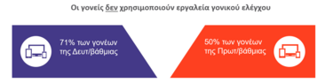 Παρότι στην Πρωτοβάθμια Εκπαίδευση σύμφωνα με τους μαθητές το 50% των γονέων χρησιμοποιεί εργαλεία γονικού ελέγχου, στη Δευτεροβάθμια εκπαίδευση η απουσία εποπτείας είναι εμφανής: οι μαθητές/τριες δηλώνουν ότι το 71% των γονέων δεν χρησιμοποιεί κανένα εργαλείο.