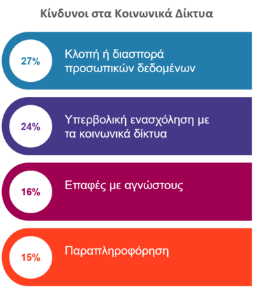 Σύμφωνα με τις απαντήσεις των μαθητών Γυμνασίου/Λυκείου, ο σημαντικότερος κίνδυνος που αντιλαμβάνονται από τη χρήση των κοινωνικών δικτύων είναι η κλοπή ή διασπορά προσωπικών δεδομένων (27%). Ακολουθεί η παράσυρση σε υπερβολική ενασχόληση με τα κοινωνικά δίκτυα (24%), γεγονός που υποδηλώνει ότι τα παιδιά αναγνωρίζουν τον κίνδυνο εθισμού και σπατάλης χρόνου. Στη συνέχεια, αναφέρουν ως κίνδυνο τις επαφές με αγνώστους (16 %) και τέλος η παραπληροφόρηση (15 %) αξιολογείται ως επίσης υπαρκτός αλλά λιγότερο άμεσος κίνδυνος.