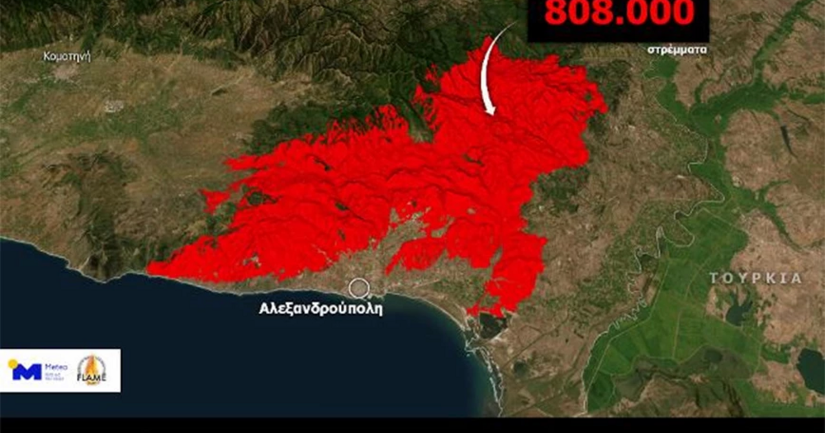 Όπως προκύπτει από την ανάλυση των δορυφορικών δεδομένων, η συνολική έκταση που κατέκαψε η δασική πυρκαγιά του Έβρου, η οποία προέκυψε από τη συνένωση των πυρκαγιών σε Αλεξανδρούπολη και Δαδιά, ξεπερνά τα 808.000 στρέμματα (έως την 28.08.2023, 12:28 τοπική ώρα).