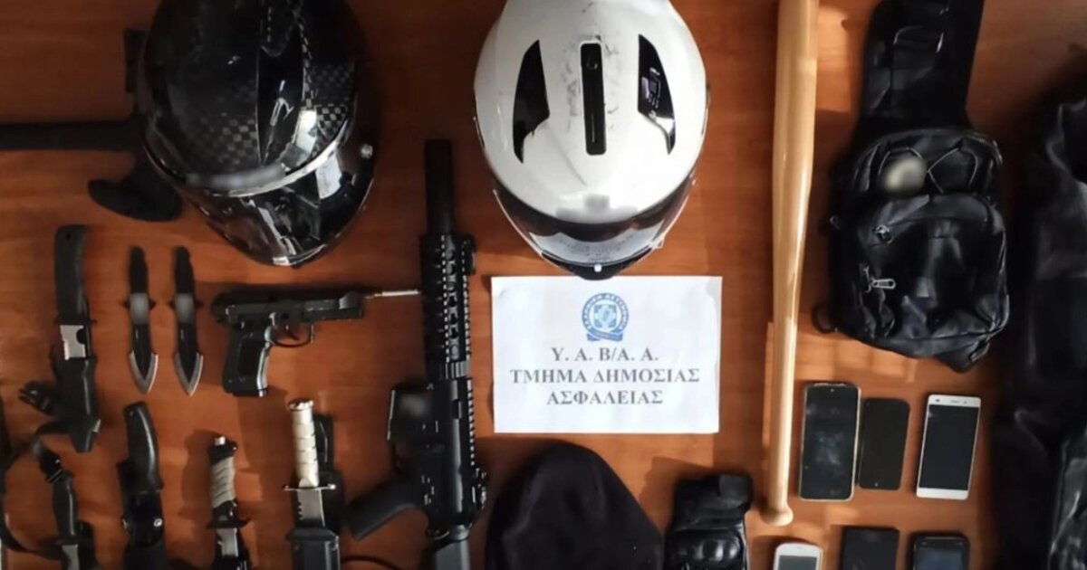 •9 μαχαίρια, ξιφίδιο, ξύλινο ρόπαλο, αεροβόλο πιστόλι και τυφέκιο, τσεκούρι,