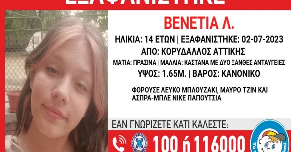 «Στις 02/07/2023, απογευματινές ώρες εξαφανίστηκε από την περιοχή του Κορυδαλλού Αττικής, η Βενετία Λ., 14 ετών. Το «Χαμόγελο του Παιδιού» ενημερώθηκε σήμερα 03/07/2023 για την εξαφάνιση και προχώρησε στη δημοσιοποίηση των στοιχείων της ανήλικης, κατόπιν αιτήματος της οικογένειας της, καθώς ενδέχεται να συντρέχουν λόγοι οι οποίοι θέτουν τη ζωή της σε κίνδυνο» αναφέρει η ανακοίνωση του «Χαμόγελου του Παιδιού».