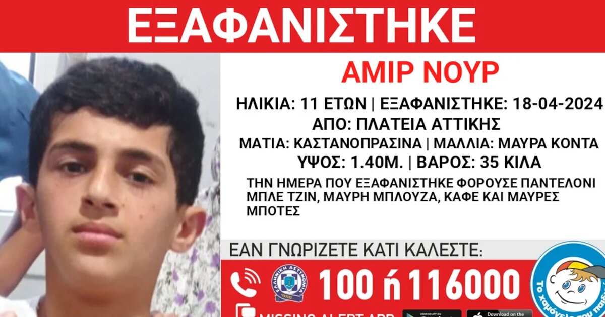 Συναγερμός έχει σημάνει στις Αρχές, μετά την εξαφάνιση του 11χρονου Αμίρ Νουρ από χώρο φιλοξενίας στην πλατεία Αττικής, σύμφωνα με σχετική ενημέρωση από το «Χαμόγελο του Παιδιού».