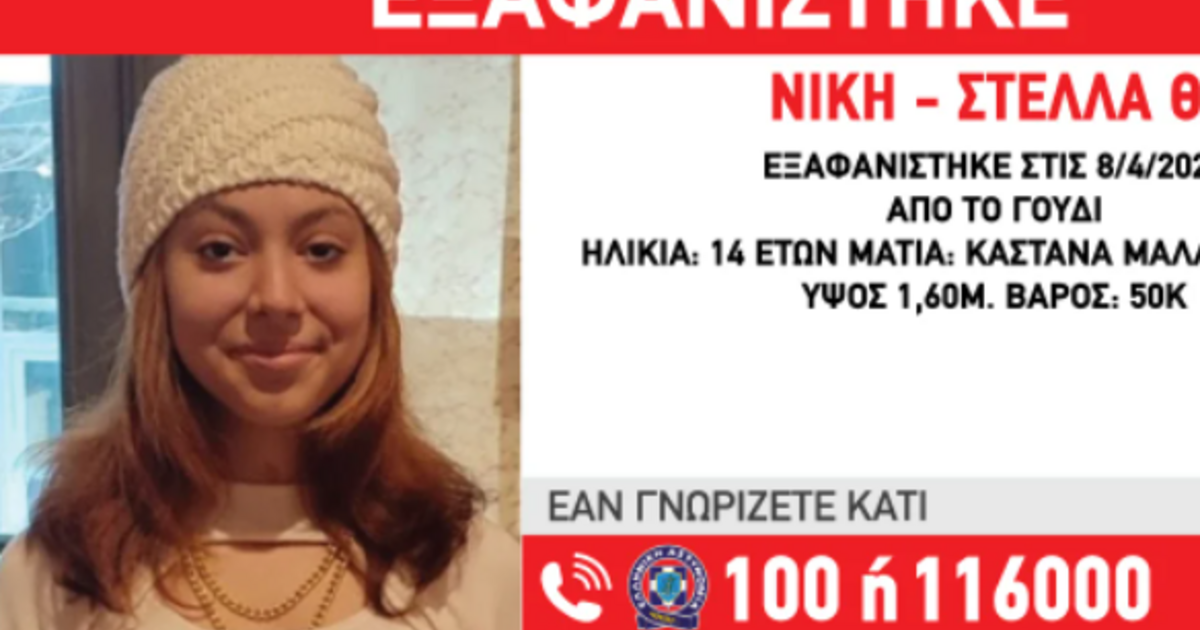 Στις 08/04/22, κατά τις απογευματινές ώρες, εξαφανίστηκε από την περιοχή Γουδί, η Νίκη – Στέλλα Θ. 14 ετών. «Το Χαμόγελο Του Παιδιού» προέβη σήμερα 10/4/2022 στην δημοσιοποίηση των στοιχείων της κατόπιν αιτήματος της οικογένειας της καθώς, υπάρχουν λόγοι που θέτουν την ζωή της σε κίνδυνο.