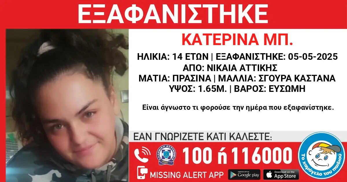 Στις 05/05/2025, πρωινές ώρες, εξαφανίστηκε από την περιοχή της Νίκαιας, η Κατερίνα Μπ., 14 ετών. «Το Χαμόγελο του Παιδιού» ενημερώθηκε για την εξαφάνιση της Κατερίνας στις 06/05/2025 και προχώρησε στην δημοσιοποίηση των στοιχείων της, κατόπιν αιτήματος της οικογένειάς της καθώς, ενδέχεται να συντρέχουν λόγοι που θέτουν την ζωή της σε κίνδυνο.