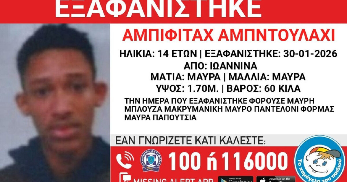 Τα ίχνη του 14χρονου χάθηκαν την Παρασκευή (30/1) από τα Ιωάννινα. Η ανακοίνωση από το “Χαμόγελο του Παιδιού”.