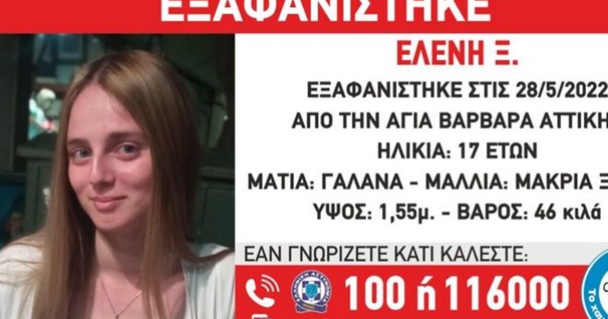 Συναγερμός έχει σημάνει για την εξαφάνιση της 17χρονης Ελένης Ξ., τα ίχνη της οποίας χάθηκαν στις 28/05/22, πρωινές ώρες, από την περιοχή της Αγίας Βαρβάρας Αττικής.