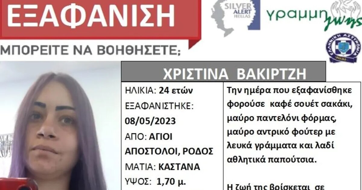 Την εξαφάνιση της 24χρονης Χριστίνας Βακιρτζή από τη Ρόδο γνωστοποιεί με ανακοίνωσή της η Γραμμή Ζωής.