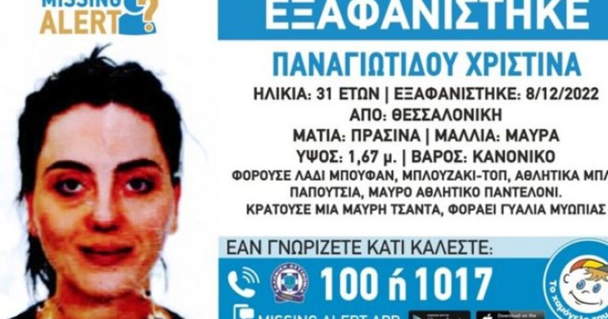 Συναγερμός έχει σημάνει στη Θεσσαλονίκη για την εξαφάνιση της 31χρονης Παναγιωτίδου Χριστίνας, τα ίχνη της οποίας χάθηκαν το πρωί της Πέμπτης 08/12/2022.