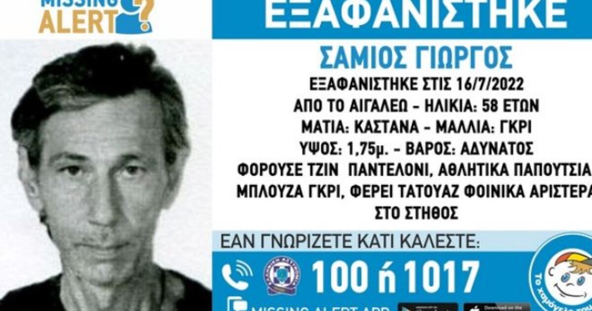 Στις 16/07/2022, εξαφανίστηκε από την περιοχή του Αιγάλεω, ο Σάμιος Γεώργιος, 58 ετών. Το «Χαμόγελο του Παιδιού» ενημερώθηκε για την εξαφάνιση του Σάμιου Γιώργου στις 25/07/2022 και προχώρησε στη δημοσιοποίηση των στοιχείων του ενήλικου σήμερα, Τρίτη (26/07) κατόπιν αιτήματος του οικογενειακού του περιβάλλοντος, καθώς ενδέχεται να συντρέχουν λόγοι οι οποίοι θέτουν τη ζωή του σε κίνδυνο.