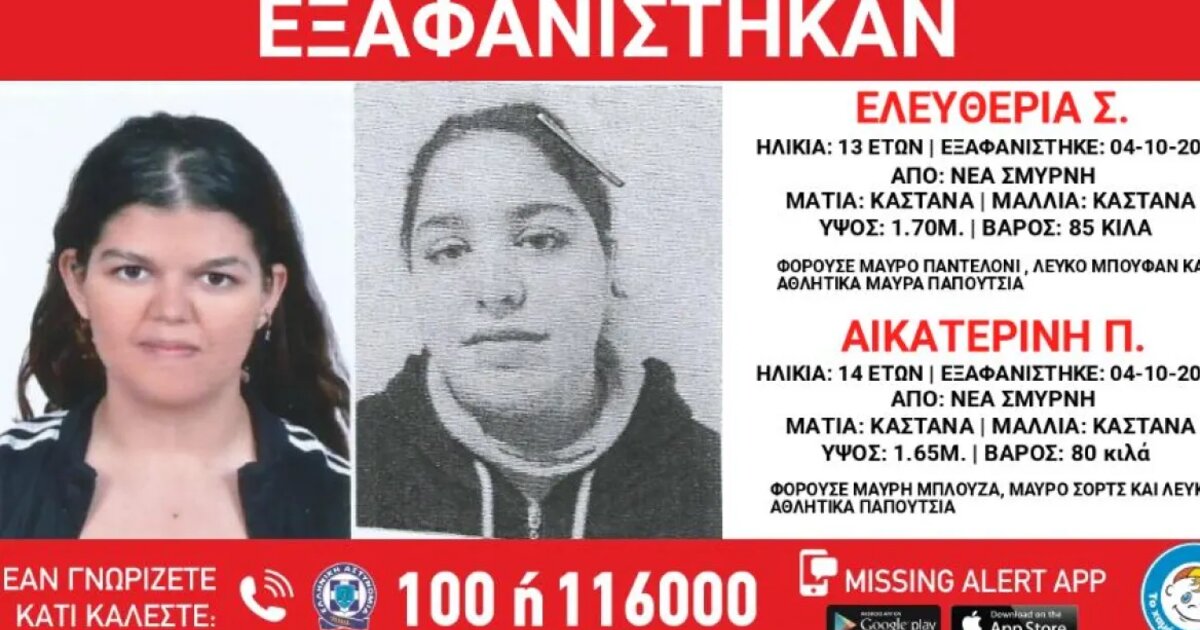 Συναγερμός σήμανε στις Αρχές για την εξαφάνιση της 13χρονης Ελευθερίας Σ. και της 14χρονης Αικατερίνης Π., τα ίχνη των οποίων χάθηκαν το μεσημέρι της Τετάρτης (4/10), από τη Μονάδα Κοινωνικής Φροντίδας Παιδόπολη «Αγία Βαρβάρα», στην περιοχή της Νέας Σμύρνης.
