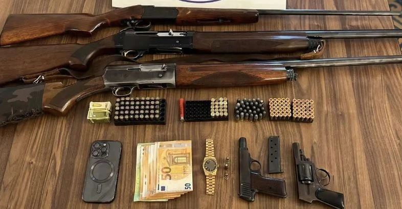 Σε σωματική έρευνα, καθώς και σε έρευνα που πραγματοποιήθηκε σε οικία, βρέθηκαν και κατασχέθηκαν, -3- κυνηγετικές καραμπίνες, περίστροφο, πιστόλι, -251- φυσίγγια, 500 ευρώ, ρολόι και κινητό τηλέφωνο.