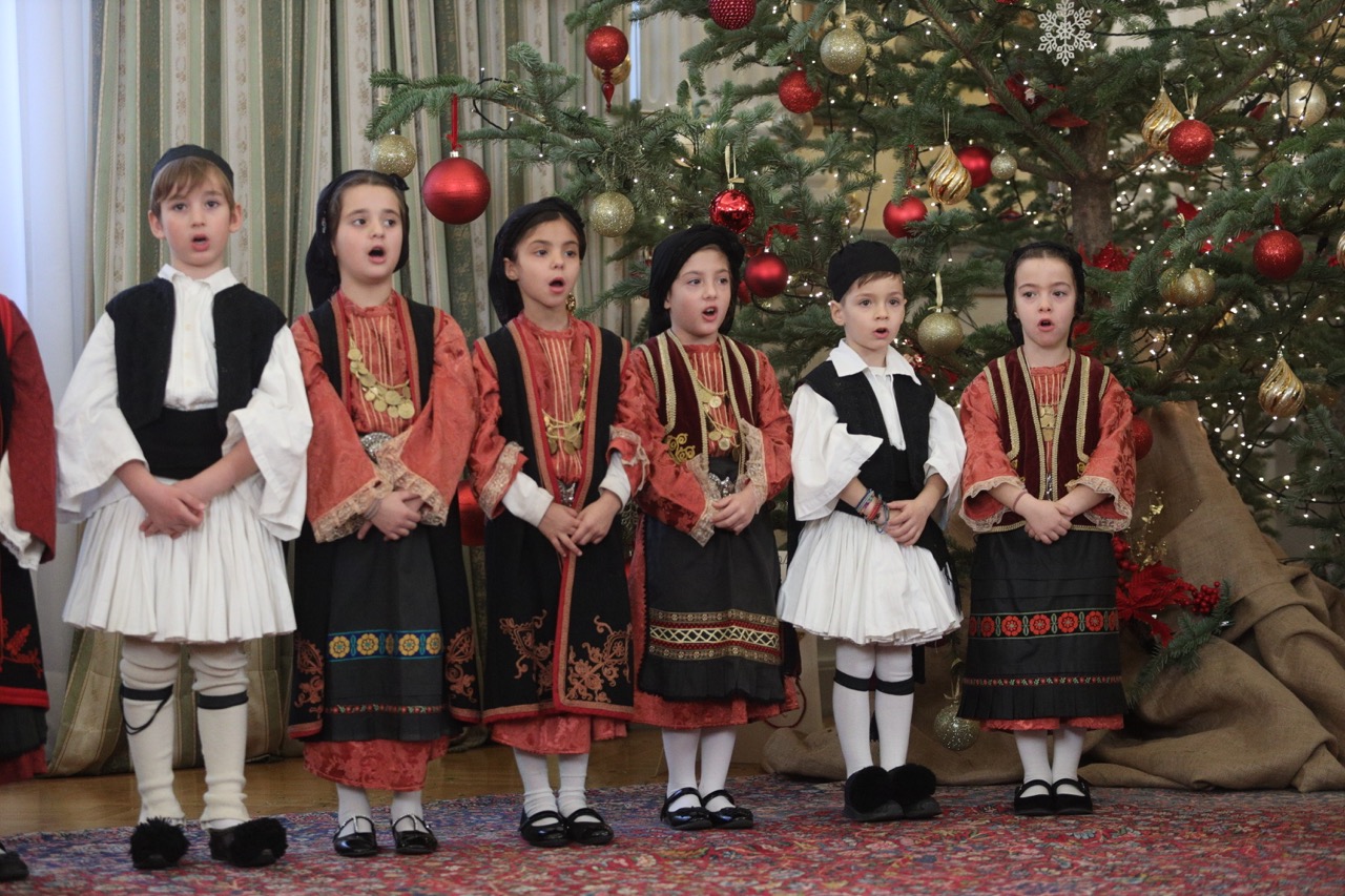 Δίπλα από το εντυπωσιακό χριστουγεννιάτικο δέντρο, η κ. Σακελλαροπούλου άκουσε διαδοχικά τα κάλαντα από το Κέντρο Παιδιού και Εφήβου, τον Όμιλο Βρακοφόρων Κρήτης, μαθητές της ΣΤ' τάξης των ιδιωτικών Εκπαιδευτηρίων Διαμαντόπουλου - Μπαρκαγιάννη, την Ένωση Ηπειρωτών Αγίου Δημητρίου Αττικής «Το Κούγκι», την παιδική χορωδία και την χορευτική ομάδα της σχολής χορού της Γενικής Αστυνομικής Διεύθυνσης Αττικής, το Μουσικό Σχολείο Πτολεμαΐδας, το Λύκειο των Ελληνίδων Παράρτημα Ραφήνας, και την Εύξεινο Λέσχη Ποντίων Νάουσας - Εθνική Βιβλιοθήκη Αργυρουπόλεως «Ο Κυριακίδης».