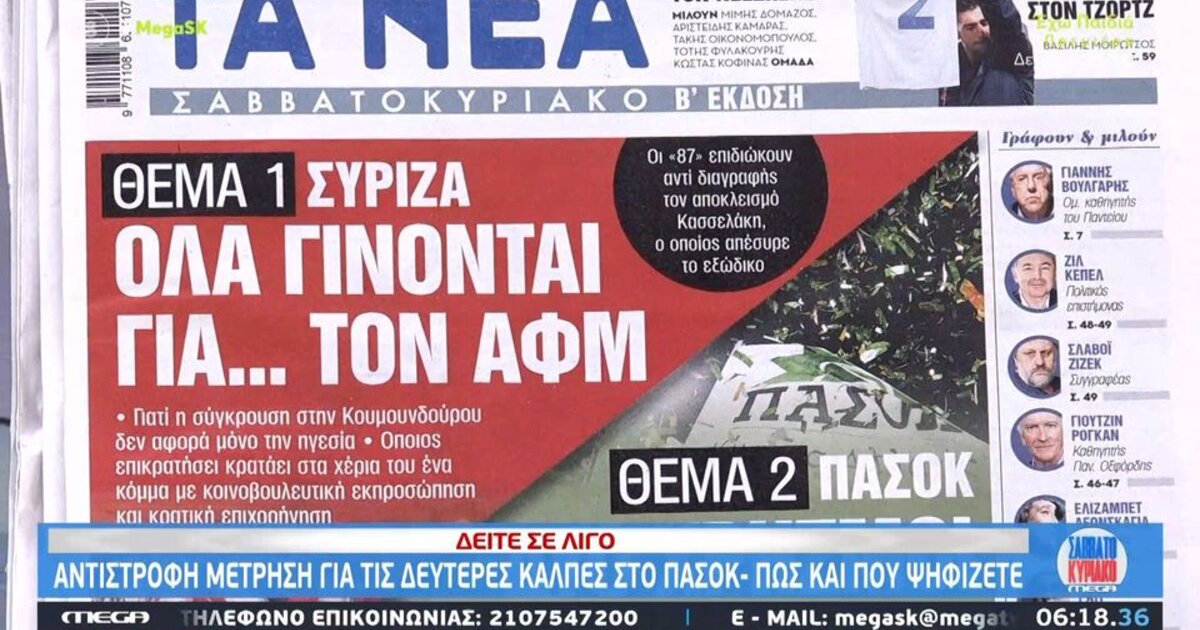 ΤA NEA ΣΑΒΒΑΤΟΚΥΡΙΑΚΟ: ΘΕΜΑ 1 ΣΥΡΙΖΑ ΟΛΑ ΓΙΝΟΝΤΑΙ ΓΙΑ... ΤΟΝ ΑΦΜ - ΘΕΜΑ 2 ΠΑΣΟΚ ΔΥΟ ΧΡΗΣΜΟΙ ΒΓΑΖΟΥΝ ΝΙΚΗΤΗ
