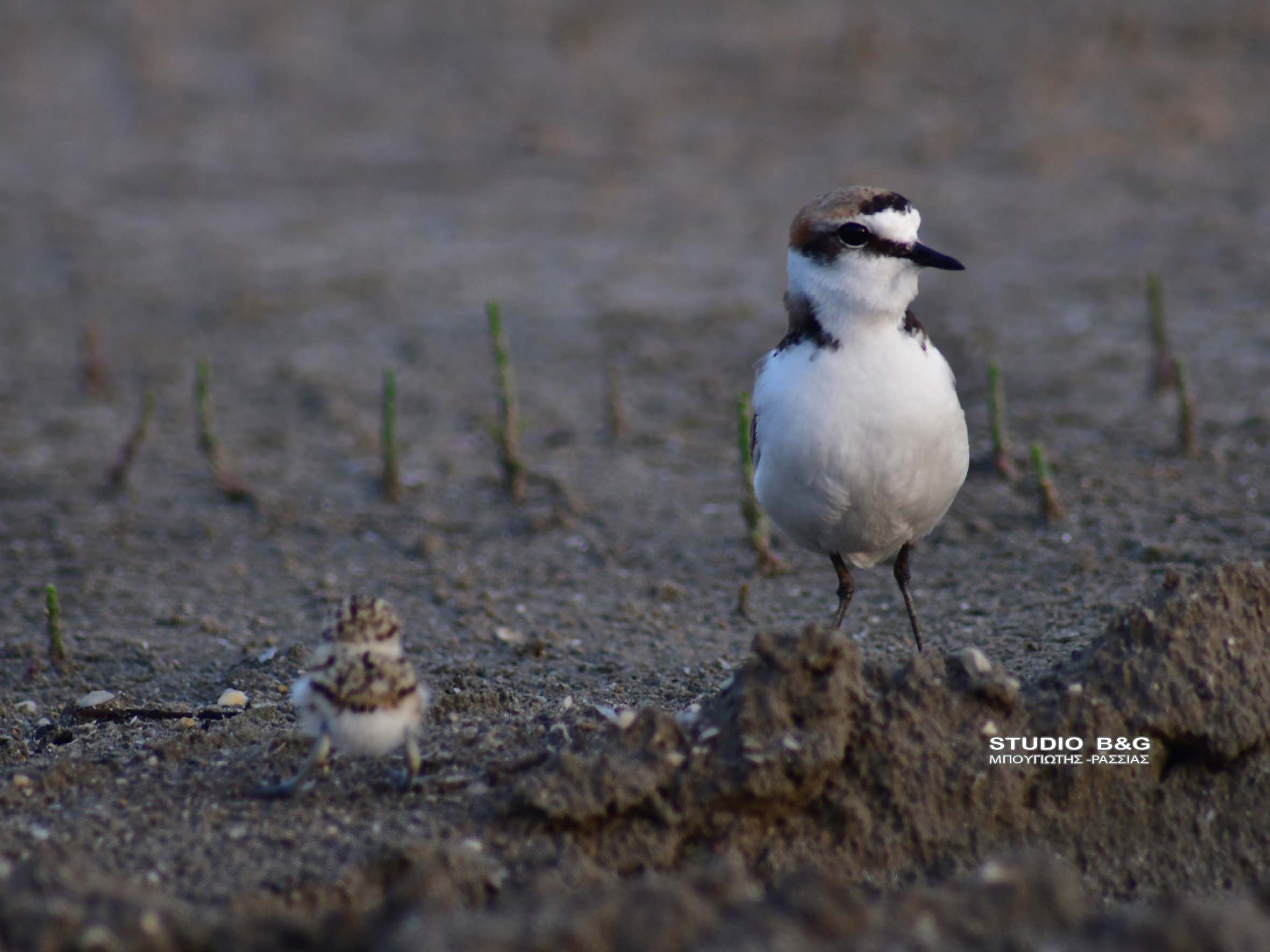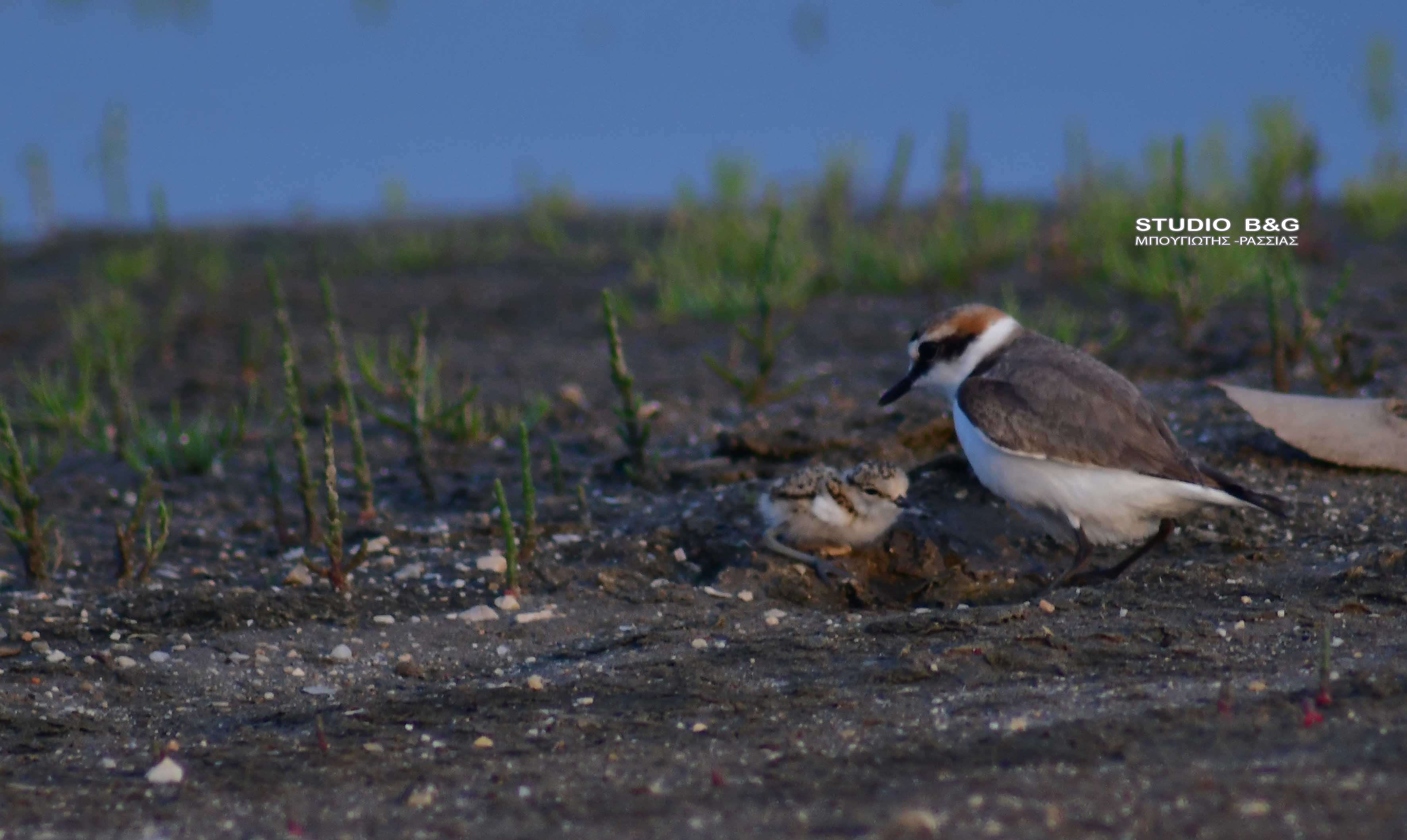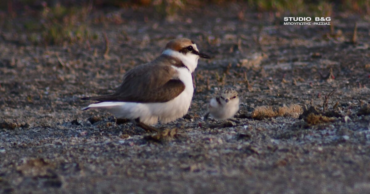 Πτηνό, του είδου θαλασσοσφυρίχτες (Charadrious alexandrinus), εθεάθη με το μικρό του σε τοποθεσία στον υδροβιότοπο Νέας Κίου στην Αργολίδα, την Παρασκευή 6 Μαΐου 2022.