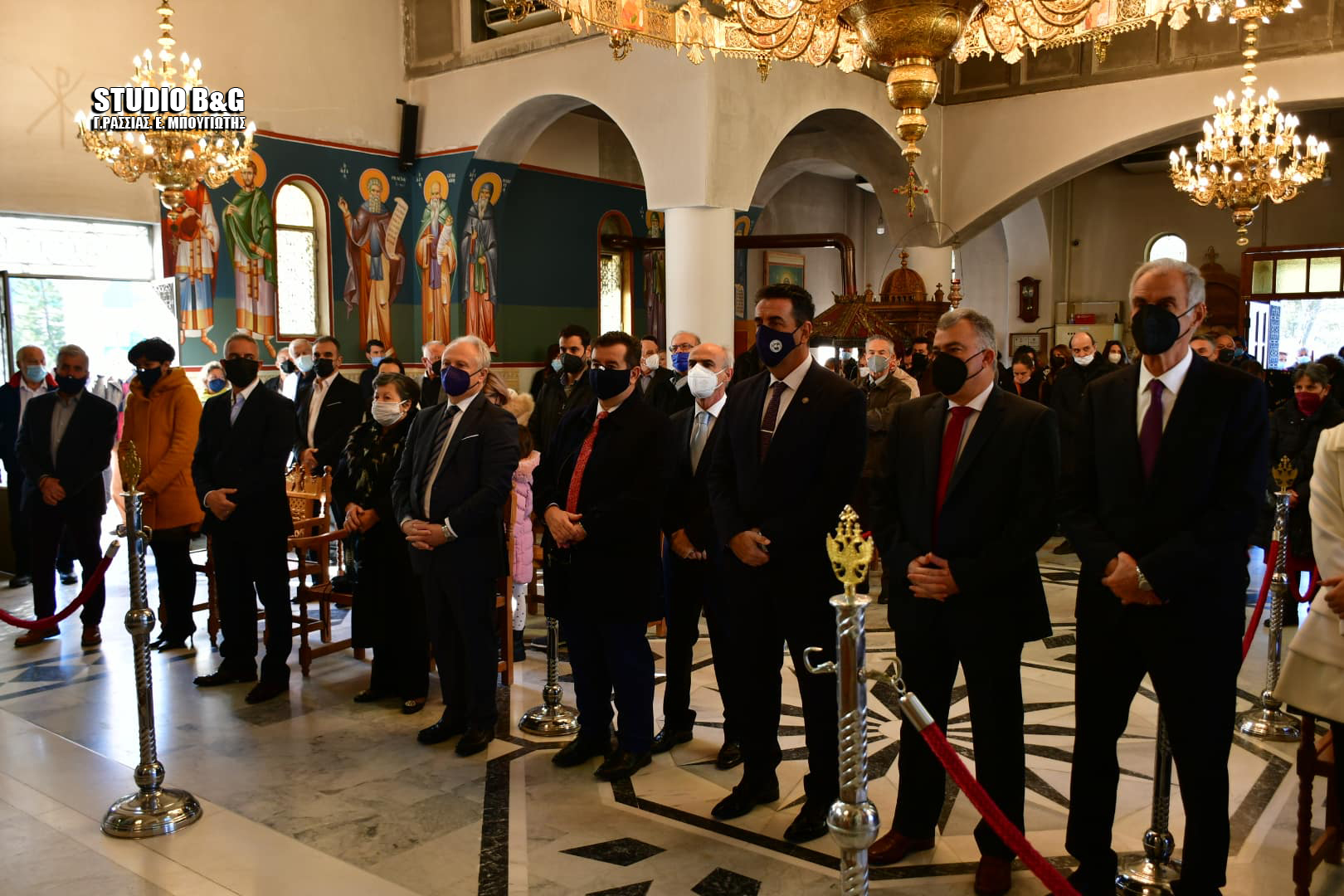 Προηγήθηκε θεία λειτουργία και ο μεγάλος αγιασμός στον προσκυνηματικό Ιερό Ναό του Άγιου Αναστασίου στο Ναύπλιο χοροστατούντος του Μητροπολίτη Αργολίδας Νεκταρίου παρόντων των στρατιωτικών και πολιτικών αρχών του τόπου.