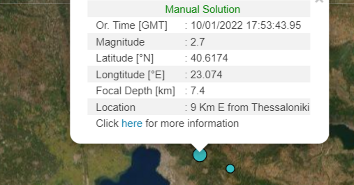 Σύμφωνα με τον Σεισμολογικό Σταθμό του ΑΠΘ, το επίκεντρο της δόνησης εντοπίζεται στην περιοχή του Χορτιάτη