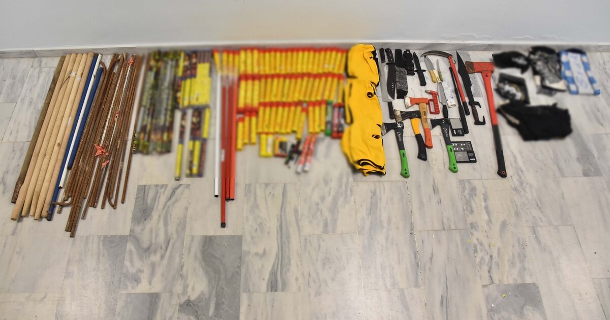 Ξύλινα ρόπαλα, μεταλλικές και πλαστικές βέργες, τσεκούρια σε διάφορα μεγέθη, μαχαίρια, πυροτεχνήματα, φωτοβολίδες και διάφορα αντικείμενα που μπορούν να προκαλέσουν σωματικές βλάβες, εντοπίστηκαν από τις αστυνομικές αρχές σε εγκαταλελειμμένο οίκημα το οποίο συνορεύει με παράρτημα λέσχης φιλάθλων αθλητικού σωματείου. Αστυνομικοί της υποδιεύθυνσης Αντιμετώπισης Βίας στους Αθλητικούς Χώρους μετά από πληροφορίες, πραγματοποίησαν έρευνα στο χτίσμα και στο οικόπεδο και ανακάλυψε πλήθος παράνομων αντικειμένων.
