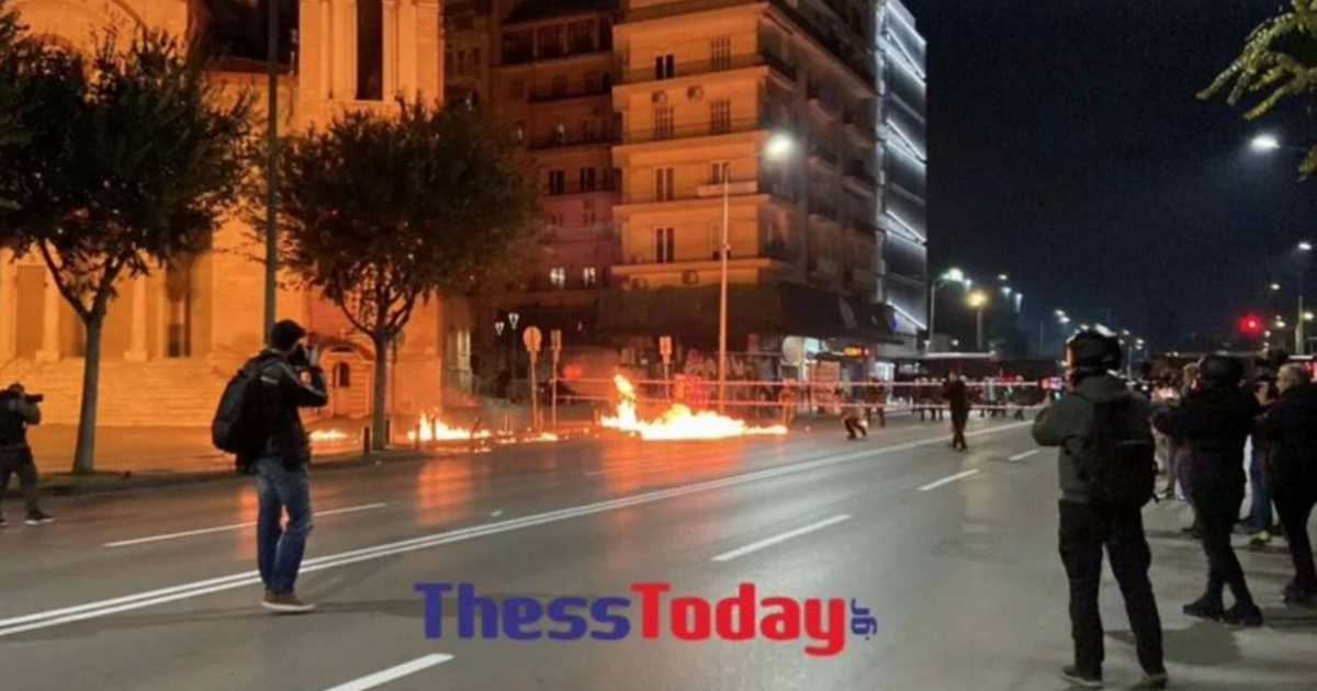 Με τη λήξη της πορείας μικρός αριθμός ατόμων, με καλυμμένα τα πρόσωπα τους, κινήθηκαν προς τις αστυνομικές δυνάμεις, που είχαν κλείσει με κλούβες την Εγνατία Οδό στο ύψος της ΕΥΑΘ και έριξαν εφτά, οκτώ αυτοσχέδιες βόμβες μολότοφ στο οδόστρωμα.