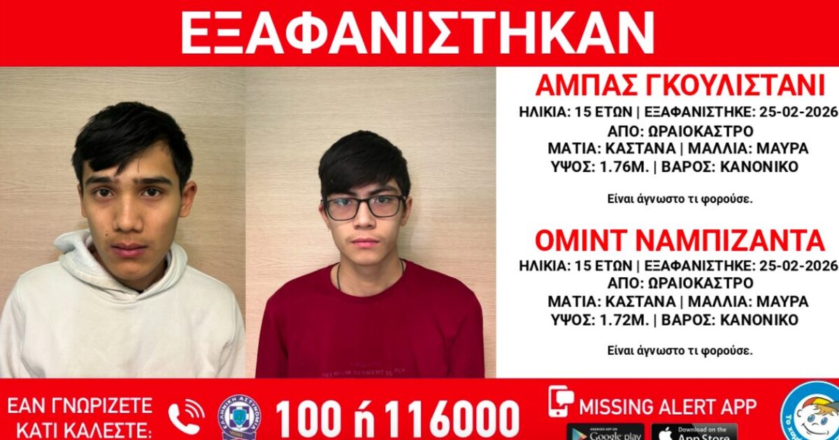 Εξαφανίστηκαν χθες, Τετάρτη, 25 Φεβρουαρίου, από χώρο φιλοξενίας ασυνόδευτων ανηλίκων στο Ωραιόκαστρο Θεσσαλονίκης ο Abbas Gulistani και ο Omid Nabizada 15 ετών, αφγανικής καταγωγής.