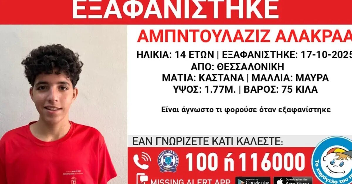 Πρόκειται για τον Αμπντουλαζίζ Αλακραά, 14 ετών, Αιγυπτιακής καταγωγής η εξαφάνιση του οποίου έγινε στις 17/10/25 και ώρα 10:30 πμ, από χώρο φιλοξενίας στη περιοχή του Ωραιοκάστρου Θεσσαλονίκης.