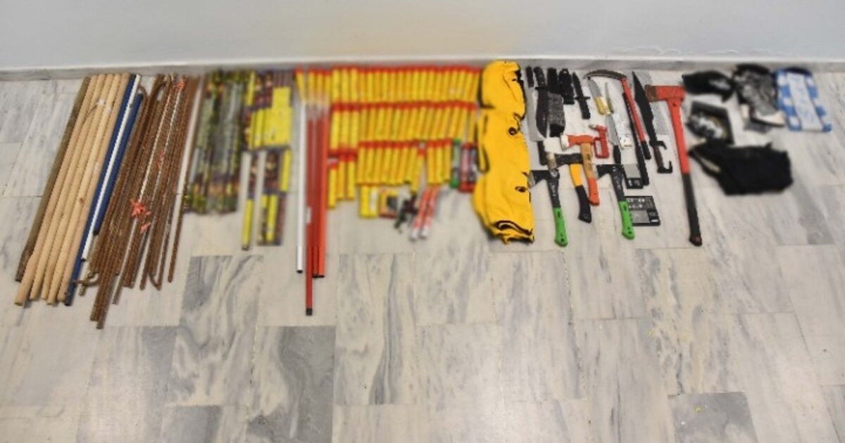 Τσεκούρια, ρόπαλα, μαχαίρια, μεταλλικές βέργες και πυροτεχνικές κατασκευές, εντοπίστηκαν και κατασχέθηκαν, μεταξύ άλλων, σε αστυνομική έρευνα που πραγματοποιήθηκε σε εγκαταλελειμμένο κτίσμα που βρίσκεται ακριβώς δίπλα από παράρτημα λέσχης φιλάθλων, στην περιοχή της Χαριλάου.