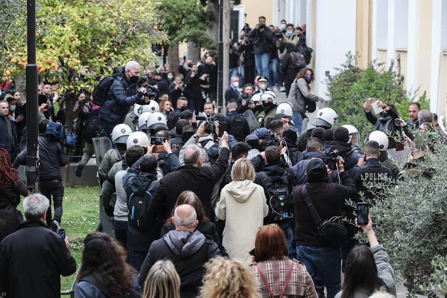 Η Πισπιρίγκου έφτασε λίγο πριν τις 11:00, στην Ευελπίδων χωρίς δικηγόρο, φορώντας αλεξίσφαιρο γιλέκο, ένα μαύρο μπουφάν και κουκούλα.