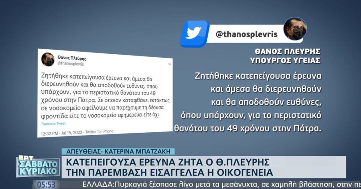 Μετά από την αξιολόγηση του πορίσματος της κατεπείγουσας έρευνας ο Υπουργός Υγείας Θάνος Πλεύρης διέταξε κατεπείγουσα ΕΔΕ. Παράλληλα ζήτησε την παραίτηση του διοικητή του νοσοκομείου Πάτρας “Άγιος Ανδρέας” και την ενεργοποίηση των διατάξεων της θέσης σε αργία για όσους ευθύνονται για τη λανθασμένη αξιολόγηση του περιστατικού.