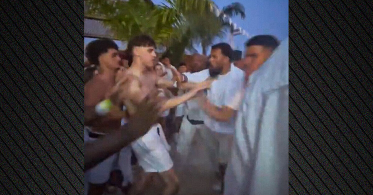 Όπως φαίνεται σε βίντεο που δημοσίευσε η Daily Mail, δύο νεαροί άνδρες με λευκά σορτς και ξεκίνησαν να τσακώνονται με μία άλλη ομάδα μεγαλύτερων σε ηλικία ανδρών που φορά επίσης λευκά ρούχα.