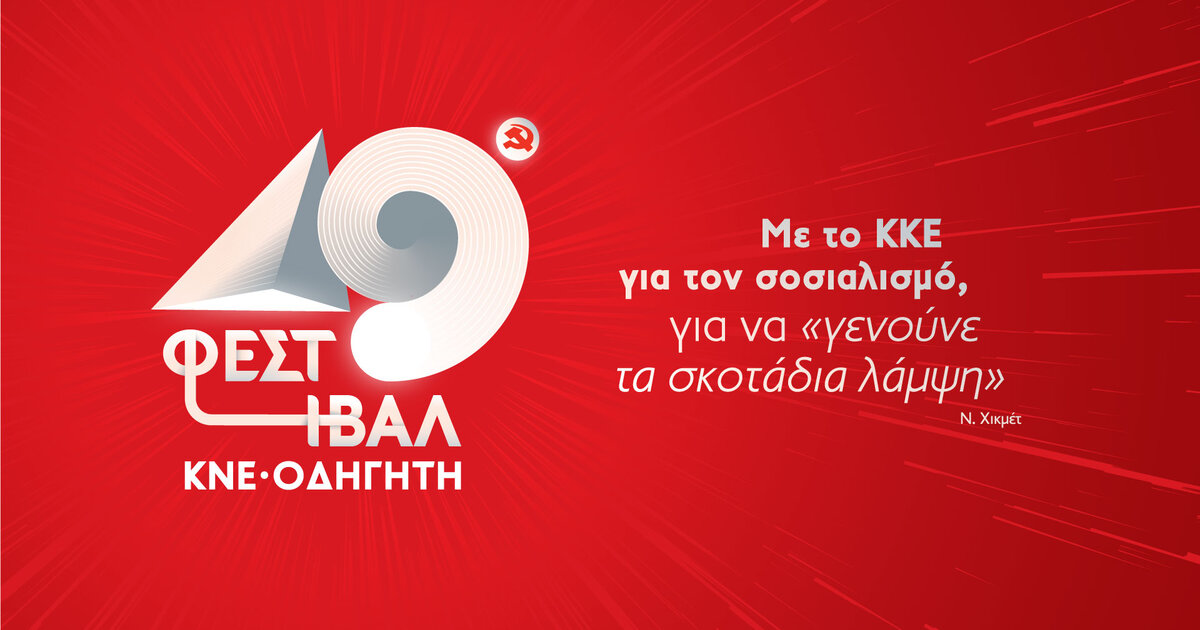 «Με το ΚΚΕ για τον σοσιαλισμό, για να «γενούνε τα σκοτάδια λάμψη» (Ν. Χικμετ)». Αυτό είναι το σύνθημα του 49ου Φεστιβάλ ΚΝΕ - Οδηγητή, εμπνευσμένο από τον μεγάλο κομμουνιστή ποιητή Ναζίμ Χικμέτ. Όπως αναφέρει η ΚΝΕ, το 49ο Φεστιβάλ ΚΝΕ-Οδηγητή ξεκινά το «ταξίδι» του σε όλη τη χώρα, ενώ οι εκδηλώσεις του θα κορυφωθούν στις 21-22-23 Σεπτεμβρίου στην Αθήνα, στον χώρο του Πάρκου Περιβαλλοντικής Ευαισθητοποίησης «Αντώνης Τρίτσης».