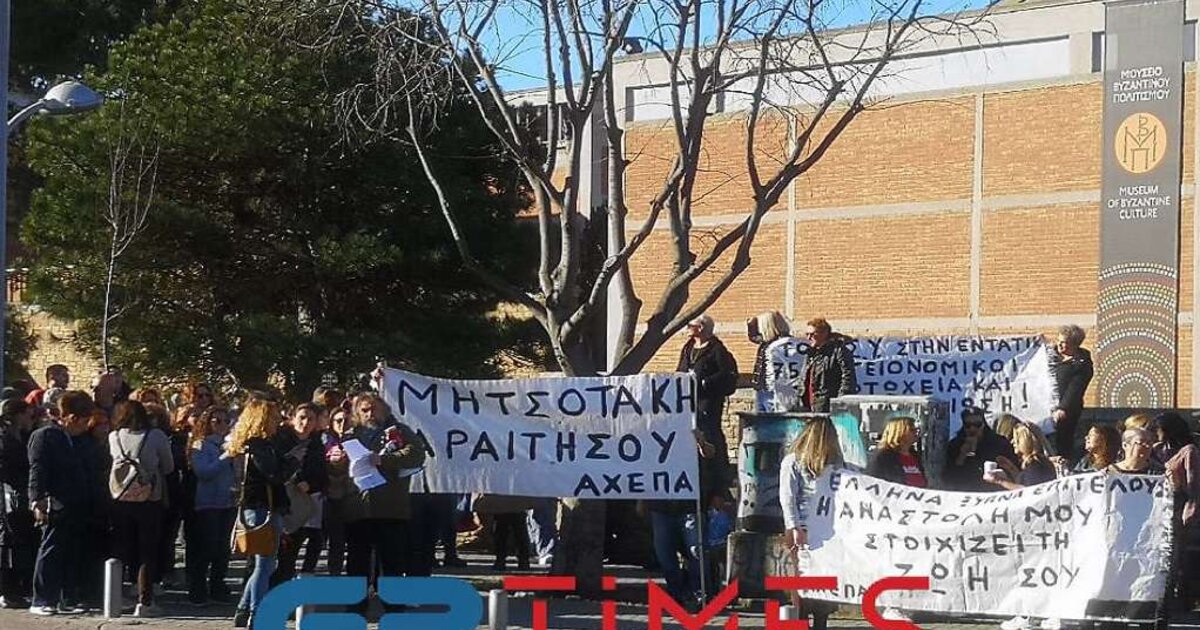 Συγκέντρωση διαμαρτυρίας έξω από το συνεδριακό κέντρο Ιωάννης Βελλίδης στη Θεσσαλονίκη, στο οποίο πραγματοποιείται σήμερα το πρώτο συνέδριο της Νέας Δημοκρατίας παρουσία του Κυριάκου Μητσοτάκη, πραγματοποιούν υγειονομικοί που διαμαρτύρονται για τις αναστολές εργασίας.