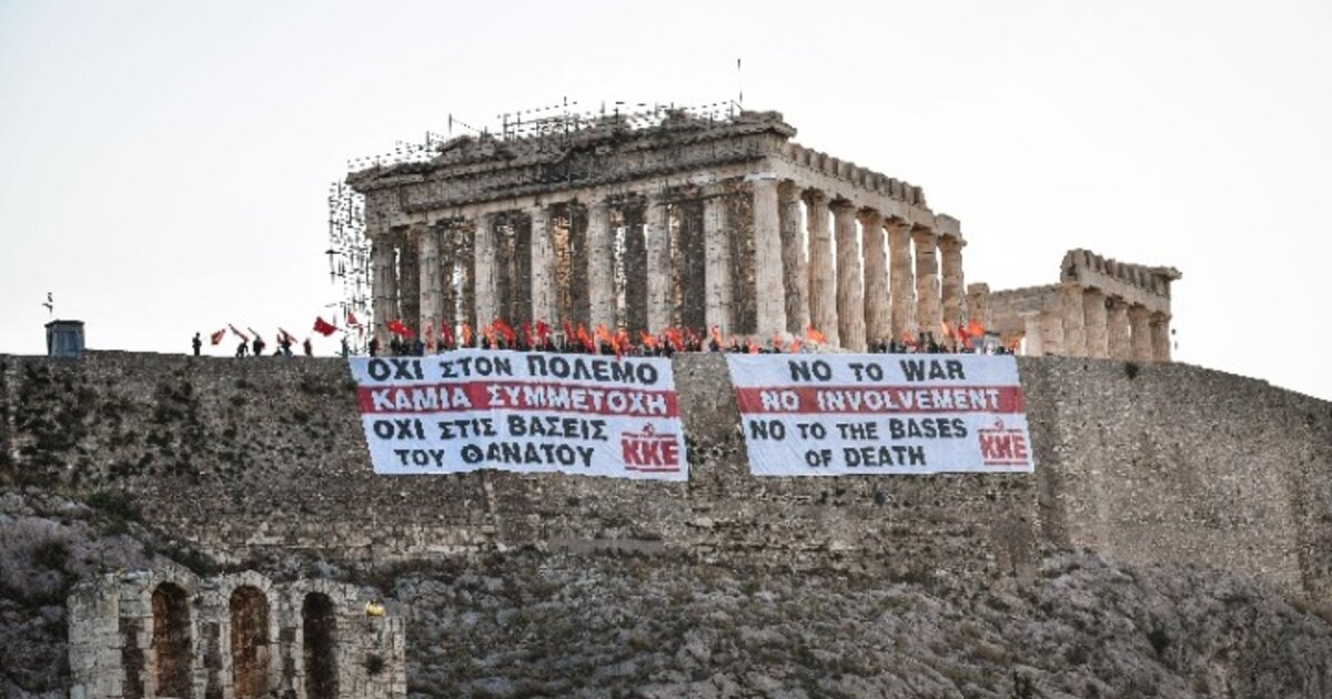 Περισσότερα από 100 άτομα με σημαίες και διπλωμένα πανό παραβίασαν με τη χρήση λοστών, τόσο την κεντρική πύλη εισόδου όσο και την εσωτερική πύλη ασφαλείας. Στη συνέχεια, αγνοώντας τις υποδείξεις του φυλακτικού προσωπικού, ανάρτησαν στο νότιο τείχος της Ακρόπολης δύο πανό με συνθήματα «όχι στον πόλεμο, καμιά συμμετοχή, όχι στις βάσεις του θανάτου» στην ελληνική και στην αγγλική γλώσσα.